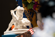Within the installation, the foot appears repeatedly through socks and shoes as reference to the above passage. Theology collides again with the locker room through the logic of fetish and foot worship. Gay fetish culture has long fixated on locker rooms and on objects such as underwear, socks, and shoes—the holy grail of imbued items. These objects stand in for the absent body. Atop one locker sits a bust of Michelangelo’s David, a gold Adidas shoe strapped across his face, he is lost in lust worshiping it.